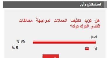 وأيد 95% من القراء تكثيف الحملات لمواجهة مخالفات قائدى التوك توك ، بينما رفض 5% موضوع الاستطلاع.