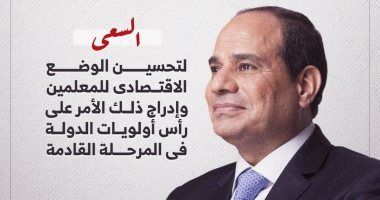وجه الرئيس بصرف حافز التدريس بمبلغ 1000 جنيه، اعتباراً من أول نوفمبر 2025، والسعى لتحسين الوضع الاقتصادى للمعلمين وإدراج ذلك الأمر على رأس أولويات الدولة فى المرحلة القادمة.