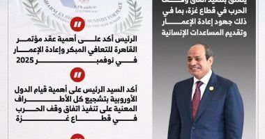 وأشار المتحدث الرسمي، إلى أن الرئيس أكد على أهمية عقد مؤتمر القاهرة للتعافي المبكر وإعادة الإعمار في نوفمبر 2025، والبناء في هذا الصدد على الزخم الذي ولدته قمة شرم الشيخ للسلام.