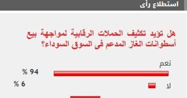 وأيد 94% من القراء مطالب تكثيف الحملات الرقابية لمواجهة بيع أسطوانات الغاز المدعم فى السوق السوداء، بينما رفض 6% مطالب تكثيف الحملات الرقابية لمواجهة بيع أسطوانات الغاز المدعم فى السوق السوداء.
