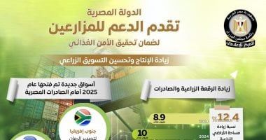 نشر المركز الإعلامي لمجلس الوزراء إنفوجرافات عبر منصاته على مواقع التواصل الاجتماعي، استعرض خلالها أبرز أوجه الدعم الذي تقدمه الدولة المصرية للمزارعين، لضمان تحقيق الأمن الغذائي.
