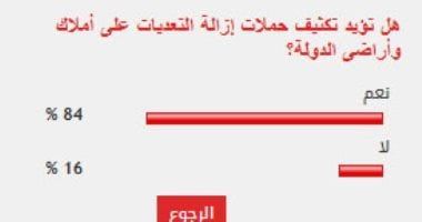 وأيد 84% من القراء مطالب تكثيف حملات إزالة التعديات على أملاك وأراضى الدولة، بينما رفض 16% مطالب تكثيف حملات إزالة التعديات على أملاك وأراضى الدولة.