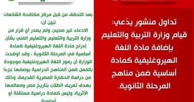 بعد التحقق من قِبل مركز مكافحة الشائعات تبيّن أن الادعاء غير صحيح، ولم يصدر أي قرار من وزارة التربية والتعليم والتعليم الفني بشأن إدراج مادة اللغة الهيروغليفية كمادة أساسية في المرحلة الثانوية.