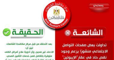 الخميس، 06 نوفمبر 2025 01:03 منفى مركز مكافحة الشائعات التابع لنقابة الإعلاميين برئاسة الدكتور طارق سعده، نقيب الإعلاميين ، ما تداوله بعض حسابات على مواقع وسائل التواصل الاجتماعي من منشور يزعم وجود نقص حاد في عقار "الإيبوتين" المستخدم في علاج أمراض الكلى، مما تسبب – بحسب الادعاء – في معاناة المنتفعين بخدمات التأمين الصحي.