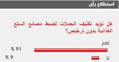 وأيد 91% من القراء مطالب تكثيف الحملات لضبط مصانع السلع الغذائية بدون ترخيص، بينما رفض 9% مطالب تكثيف الحملات لضبط مصانع السلع الغذائية بدون ترخيص.