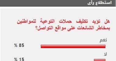 وأيد 85% من القراء مطالب تكثيف حملات التوعية للمواطنين بمخاطر الشائعات على مواقع التواصل، بينما رفض 15% مطالب تكثيف حملات التوعية للمواطنين بمخاطر الشائعات على مواقع التواصل.
