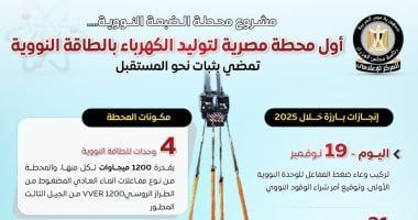 وتناول الإنفوجراف عددًا من الإنجازات البارزة خلال عام 2025، حيث شهد اليوم، الموافق 19 نوفمبر 2025، تركيب وعاء ضغط المفاعل للوحدة النووية الأولى، إلى جانب توقيع أمر شراء الوقود النووي، حيث وصل الوعاء من روسيا إلى ميناء الضبعة التخصصي يوم 21 أكتوبر.