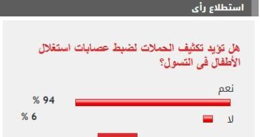 وأيد 94% من تكثيف الحملات لضبط عصابات استغلال الأطفال فى التسول، بينما رفض 6% موضوع الاستطلاع.