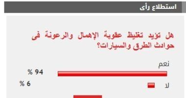 وأيد 94% من القراء تغليظ عقوبة الإهمال والرعونة فى حوادث الطرق والسيارات، بينما رفض 6% موضوع الاستطلاع.