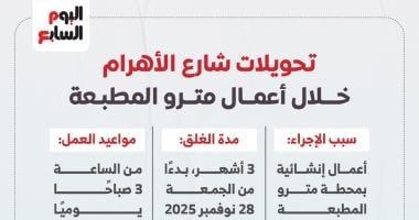 يشرح انفوجراف التحويلات المرورية لمدة 90 يوما بشارع الهرم، حيث تنظم الإدارة العامة لمرور الجيزة حركة المرور وتنفذ تحويلات مرورية مؤقتة نتيجة بعض الأعمال الإنشائية بمحطة مترو المطبعة.