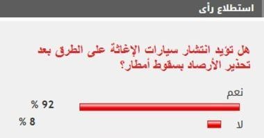 في استطلاع للراى طرحه اليوم السابع على قرائه الأعزاء تحت عنوان هل تؤيد انتشار سيارات الإغاثة على الطرق بعد تحذير الأرصاد بسقوط أمطار؟، أيد غالبية القراء انتشار سيارات الإغاثة على الطرق بعد تحذير الأرصاد بسقوط أمطار.