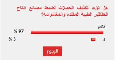 وأيد 97% من القراء تكثيف الحملات لضبط مصانع إنتاج العقاقير الطبية المقلدة والمغشوشة، بينما رفض 3% مطالب تكثيف الحملات لضبط مصانع إنتاج العقاقير الطبية المقلدة والمغشوشة.