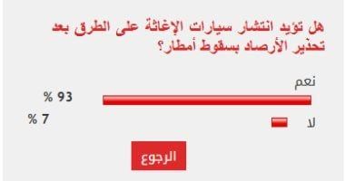 وأيد 93% من القراء مطالب تكثيف نشر سيارات الإغاثة، مع توقعات الأرصاد باستمرار سقوط الأمطار،، بينما عارض 7% من القراء مطالب تكثيف نشر سيارات الإغاثة، مع توقعات الأرصاد باستمرار سقوط الأمطار.