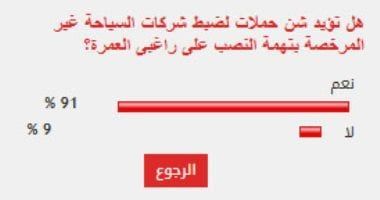 وأيد 91% من القراء مطالب شن حملات لضبط شركات السياحة غير المرخصة بتهمة النصب على راغبى العمرة، بينما عارض 9% من القراء مطالب شن حملات لضبط شركات السياحة غير المرخصة بتهمة النصب على راغبى العمرة.