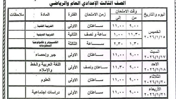 قررت وزارة التربية والتعليم والتعليم الفني أن يبدأ جدول امتحانات الشهادة الإعدادية 2026 الترم الأول من 17 يناير 2026 حتى 22 يناير 2026