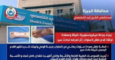 الأربعاء، 17 ديسمبر 2025 03:20 مكشفت وزارة الصحة والسكان عن قيان مستشفى الشيخ زايد التخصصى بإجراء جراحة ميكروسكوبية دقيقة ومعقدة لإنقاذ قدم طفل عمرة 3 سنوات إثر تعرضه لحادث سير .