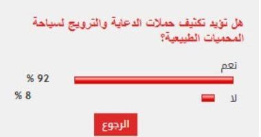 وأيد 92% من القراء مطالب تكثيف حملات الدعاية والترويج لسياحة المحميات الطبيعية، بينما عارض 8% من القراء مطالب تكثيف حملات الدعاية والترويج لسياحة المحميات الطبيعية.