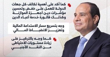 وأشار المتحدث الرسمي، إلى أن الرئيس وجه بتسريع مسار الاستدامة المالية، وتعزيز الانضباط المالي وتحسين هيكل المديونية، بما يضمن توجيه موارد أكبر للقطاعات الخدمية ولجهود تعزيز التنمية البشرية. كما وجه الرئيس بالتركيز على زيادة مستويات الاحتياطي من النقد الأجنبي، وتلبية الاحتياجات التمويلية اللازمة لتعزيز الجهود التنموية.