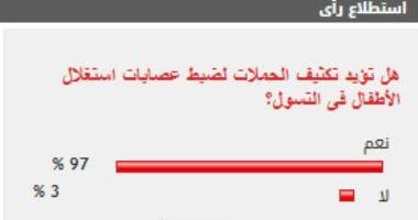 وأيد 97% من القراء مطالب تكثيف الحملات لضبط عصابات استغلال الأطفال فى التسول، بينما عارض 3% من القراء مطالب تكثيف الحملات لضبط عصابات استغلال الأطفال فى التسول.
