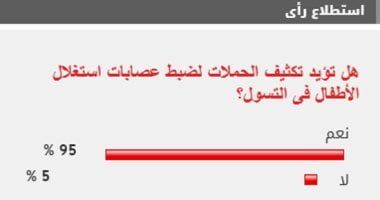 وأيد 95% من القراء مطالب تكثيف الحملات لضبط عصابات استغلال الأطفال فى التسول، بينما عارض 5% من القراء مطالب تكثيف الحملات لضبط عصابات استغلال الأطفال فى التسول.