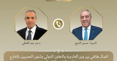 الإثنين، 02 مارس 2026 01:31 مجرى اتصال هاتفي بين د. بدر عبد العاطي، وزير الخارجية والتعاون الدولي والمصريين بالخارج، وحسين الشيخ، نائب الرئيس الفلسطيني، تم خلاله تناول تطورات الأوضاع في الضفة الغربية وقطاع غزة، فضلاً عن مجمل الأوضاع في المنطقة في ظل التصعيد العسكري الراهن.
