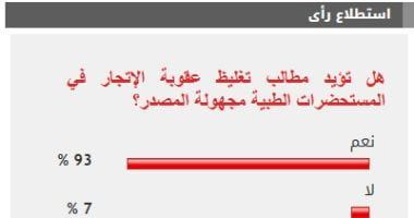 وأيد 93% من القراء مطالب تغليظ عقوبة الإتجار في المستحضرات الطبية مجهولة المصدر، بينما عارض 7% من القراء مطالب تغليظ عقوبة الإتجار في المستحضرات الطبية مجهولة المصدر.